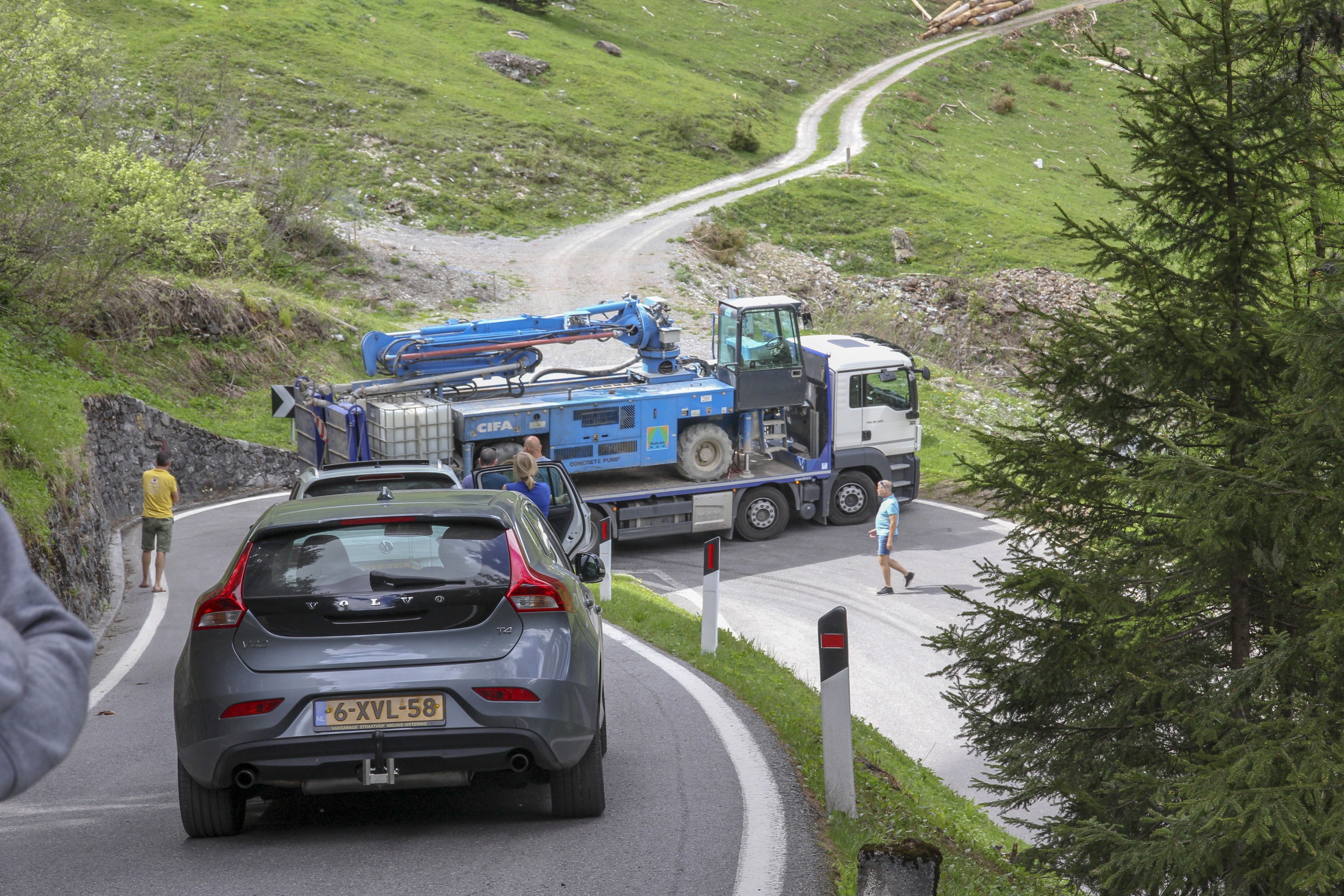 Halfway down the pass there was suddenly a traffic jam. We couldn't understand how there could be a traffic jam on the way down one of the highest passes in the Alps… Until Gavin came over the radio to tell us that a lorry had got itself beached on one of the steep hairpin turns. How it even got that far, we'll never know.